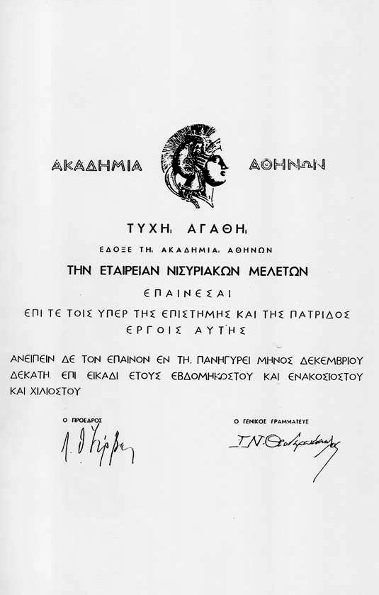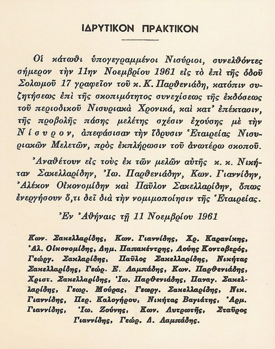 Σκοπός όλων των συλλόγων ήταν η συμπαράσταση στους νεοαφικνουμένους συμπατριώτες και η παροχή βοηθείας στη μικρή πατρίδα για την αντιμετώπιση συγκεκριμένων αναγκών. Υπάρχουν αξιοθαύμαστα τεκμήρια αυτής της βοήθειας προς την Νίσυρο. Κτήρια σχολείων, μέρος των κτηριακών εγκαταστάσεων των ιαματικών λουτρών του δήμου, υδατοδεξαμενές, πληρωμή των εξόδων για τη λειτουργία σχολείων, πληρωμή εξόδων για την παραμονή ιατρού, αποστολή φαρμάκων, ρουχισμού και τροφίμων αμέσως μετά τον πόλεμο κλπ. Αργότερα διαπίστωσαν ότι ήταν αναγκαία η ίδρυση ενός σωματείου, που θα είχε ως αποκλειστικό σκοπό την προστασία και την προβολή κάθε ιστορικού και λαογραφικού στοιχείου του νησιού μας. Ως έκφραση αυτού του ενδιαφέροντος και της αγωνίας των Νισυρίων της Αττικής, ιδρύθηκε το 1961 η Εταιρεία Νισυριακών Μελετών με έδρα την Αθήνα. Στα δεξιά του κειμένου παρατίθεται το ιδρυτικό Πρακτικό της. Είναι επιστημονικό Σωματείο μη κερδοσκοπικού χαρακτήρα, διοικείται από επταμελές Διοικητικό Συμβούλιο και από το θέρος του 2001 τελεί υπό την επίτιμον Προεδρίαν της Α. Θ. Παναγιότητος του Οικουμενικού Πατριάρχου κ.κ. Βαρθολομαίου. Η Ακαδημία Αθηνών απένειμε Έπαινον στην Εταιρεία ως αναγνώριση του επιτελούμενου από αυτήν έργου.