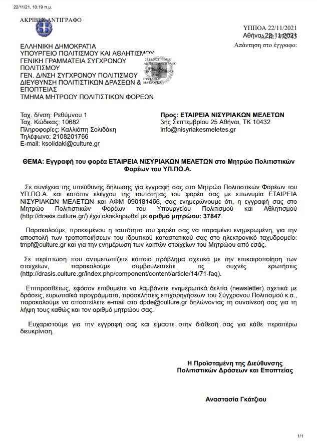 Από τον Νοέμβριο του 2021, η Εταιρεία Νισυριακών Μελετών, έχει εγγραφεί στο Μητρώο Πολιτιστικών Φορέων του Υπουργείου Πολιτισμού, με α.α. 37847. Δείτε την σχετική υπουργική απόφαση εδώ.